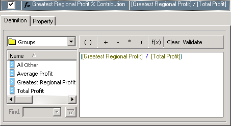 Calculation derived elements are created by defining expressions with valid combinations of operators, functions, attribute elements, and derived elements. An example of a valid expression is shown below.