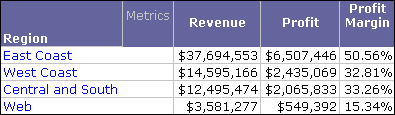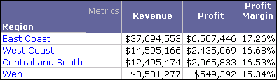 For example, the report shown below includes the Region attribute with East Coast, West Coast, and Central and South derived elements defined on it. The metrics are Revenue, Profit, and Profit Margin.