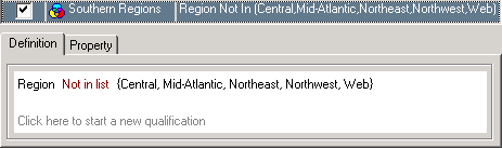 Not in List: A filter qualification using Not in List returns data for all the attribute elements you do not select, for a given attribute. A Not in List filter qualification that returns all the southern regions is shown below.