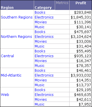 For example, in a report with Region and Category attributes and a Profit metric, you can filter the regions on the report into various geographical groups based on the region names.