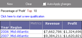Notice that only two rows of data are returned. The metric qualification has been evaluated at the level of the report grid, which is Year and Region. This gives you a view of data within the top 10% of profit for the data displayed on the report grid.