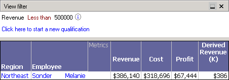 This report returns revenue, cost, and profit data for employees, while also displaying the region the employee is in. The view filter restricts the report results to only return data for those employees who generated less than $500,000 in revenue. This reduces the large number of employee results to a smaller set of employees that are generating a relatively low amount of revenue.