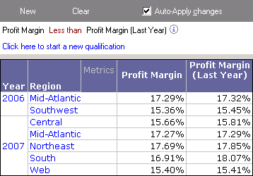 You can now review when regions had increases in profit margins. For example, from the report above you can determine that the Northwest and Southeast regions have shown increases in profit margins from 2006 to 2007.