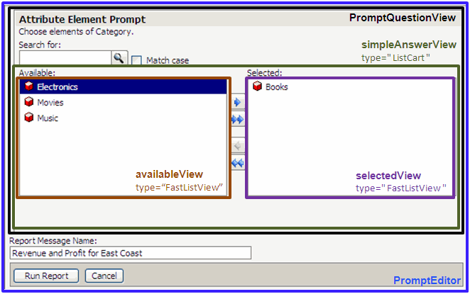 The following screenshot shows the view blocks for an attribute element prompt displayed in a shopping cart style. This prompt uses the PromptElementWidgetStyle style.