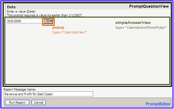 The following screenshot shows the view blocks for a value prompt displayed in a text box style with a date and time picker. This prompt uses the PromptConstantWidgetStyle style.