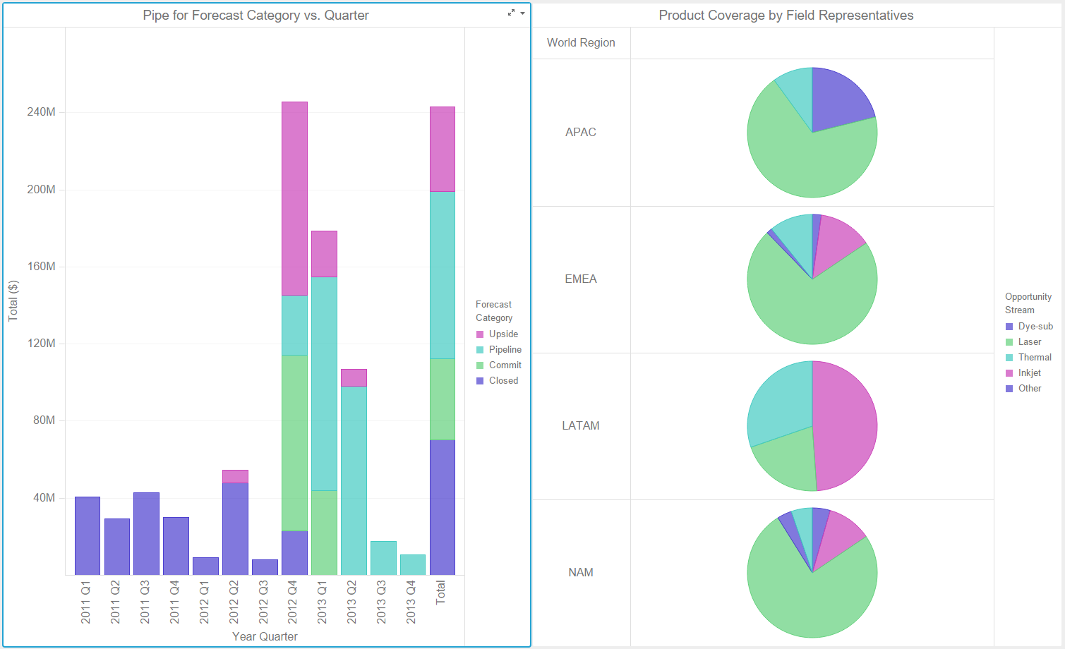 You can customize visualizations throughout your dashboard using color palettes. Each dashboard contains built-in color palettes. In addition, you can create custom color palettes. A color palette applies to the objects, such as a graph's bar risers or heat map's rectangles, that appear in all visualizations throughout a dashboard. If you customize a color for a particular attribute, all visualizations display that attribute in the same color. If you create multiple color palettes, you can choose to display your dashboard in one set of colors for one audience, and in a different set of colors for another audience.