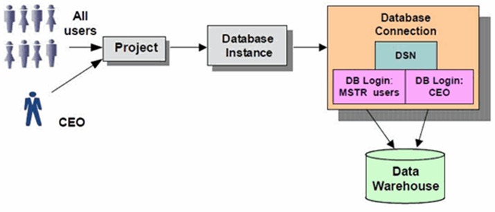 This is shown in the diagram below in which the CEO connects as CEO (using the new database login called "CEO") and all other users use the default database login "MSTR users."