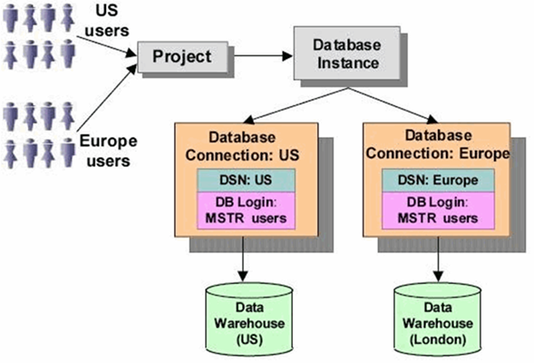 In the diagram below, the two different database connections used are "US " and "Europe". Although the data warehouse login ID for both the database connections is "MSTR users", within Strategy, the users belong to two different groups: 'US users' and 'Europe users'.