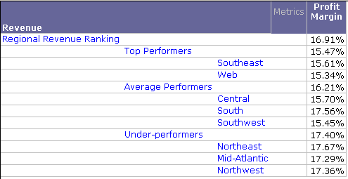 You want to create a report that ranks regions based on their revenue and provides the profit margin for each. The groups are Top Performers, Average Performers, and Under-performers.