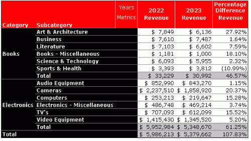 Due to space constraints, this report sample contains a report filter to include the Books and Electronics categories only.
