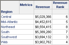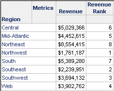As shown below, the range of Revenue Rank is now 3-8, because the metric includes all the regions, even if they are not displayed on the report.