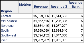 Notice that both the Revenue Rank metric and the derived metric Revenue/2 are calculated in the view evaluation order (the metrics are displayed in the View evaluation order list).