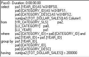Qualifications within the HAVING clause of a SQL statement are evaluated after any aggregation statement is performed. Therefore, any column expression with an aggregation function applied to it should be in the HAVING clause. For example, if your report includes Revenue aggregated with the sum function, you can include a qualification that restricts your result set to data with Revenue greater than $200,000. This restriction is performed after the Revenue data is aggregated.