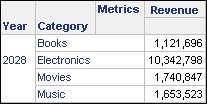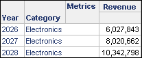 - Run the report in grid view, selecting the Year element 2028 in the Prompt Answer Wizard. The report output is restricted to Year 2028, as shown in the image below:
