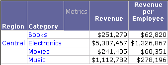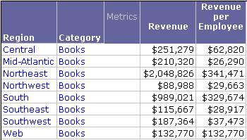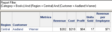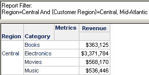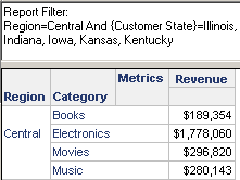 If a user selects Central in the target report, a category is also selected. When the user clicks Central in the source, if the link uses this prompt answer method, the target report displays the revenue from the Central region, but only for the category that was selected in the target. The report is filtered on Region and Category.
