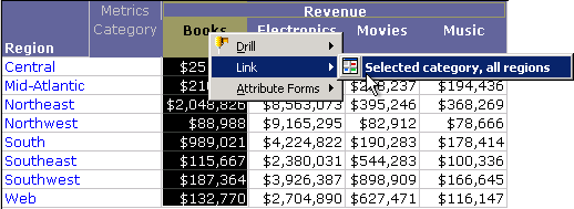 Links can pass only a single element of any attribute, but they can pass elements from different attributes at the same time. For example, with the links between the Regional Revenue and Revenue by Category reports described throughout this section, the selected region is passed to the target, when the dynamic prompt answer method is used. (See Linking Reports and Documents for the report samples.) Only the one region is passed, regardless of any other selections on the source report, because that answers the attribute element prompt in the target report.