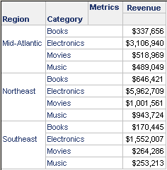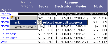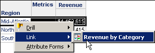 The following report contains Region on the rows, and Category and Revenue in the columns. Region contains a link, as shown in the following image:
