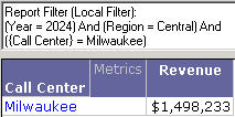 If the All Valid Units link is clicked, the target report is filtered by Year, Region, and Call Center (the selection and the attributes to the left of it), as shown below. Note that the revenue amount ($1,498,233) is less than the amount ($1,823,715) displayed in the previous report that filtered by 2024 and Central. The difference of $325,481 is Fargo's 2024 revenue contribution, as shown in the report above.