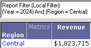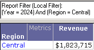 Notice that 2024 and Central are selected in the image above. If you click the Current Year and Region link, 2024 and Central are passed to the target as the prompt answers. This is confirmed in the report filter details, as shown in the report sample below. Only Central is returned, with a revenue amount ($1,823,715) that matches the revenue amount in the source report.