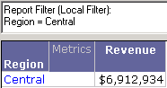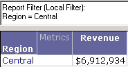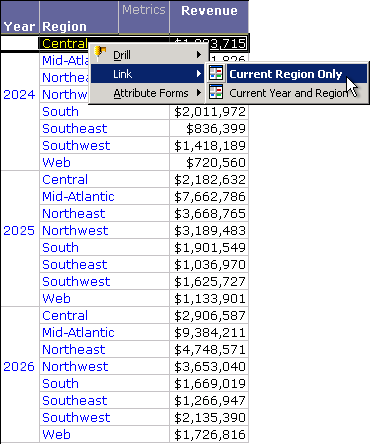 If the link uses this prompt answer method, when the user clicks Central in the target report, the target displays all the revenue for the Central region. The report is filtered on Region only.
