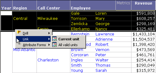 The following report is used as the source. It contains Year, Region, and Revenue. As shown below, Region contains two links, one that passes the current region only (using the Current unit prompt answer method) and another that passes the selected year and region (using the All valid units prompt answer method).