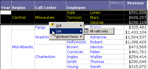 The valid units for the All valid units prompt are any elements that are to the left of or above the user selection in the source report. For example, add Call Center and Employee to the right of Region in the source report, as shown below. (The links have been renamed to the prompt answer methods.)