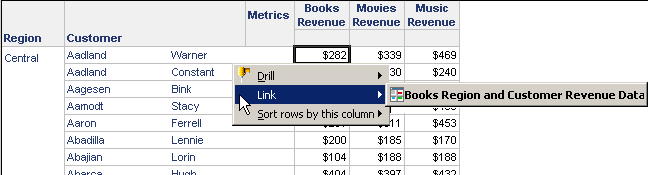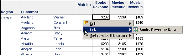 A source report contains Region, Customer, and metrics for Books Revenue, Movies Revenue, and Music Revenue. The report links from the conditional metrics to a target report, as shown below. Note that only a section of the report is shown; the report contains data for all regions and all customers.