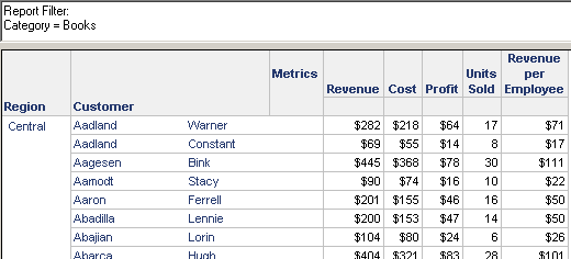 The name of the link implies that the condition from the selected metric (in this case, Category = Books) is passed to the target. The target report is executed and displays as shown below. Notice that the report is filtered for the Books category. You can confirm that by comparing the revenue amounts. Revenue for Warner Aadland in the target is $282, which is the same as the Revenue amount in the source report for the same customer.