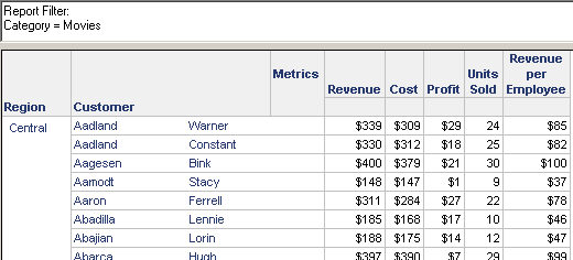 The target report is filtered by the condition on the conditional metric (Category = Movies), and the data has changed accordingly. Again, only a portion of the report is shown in the sample.