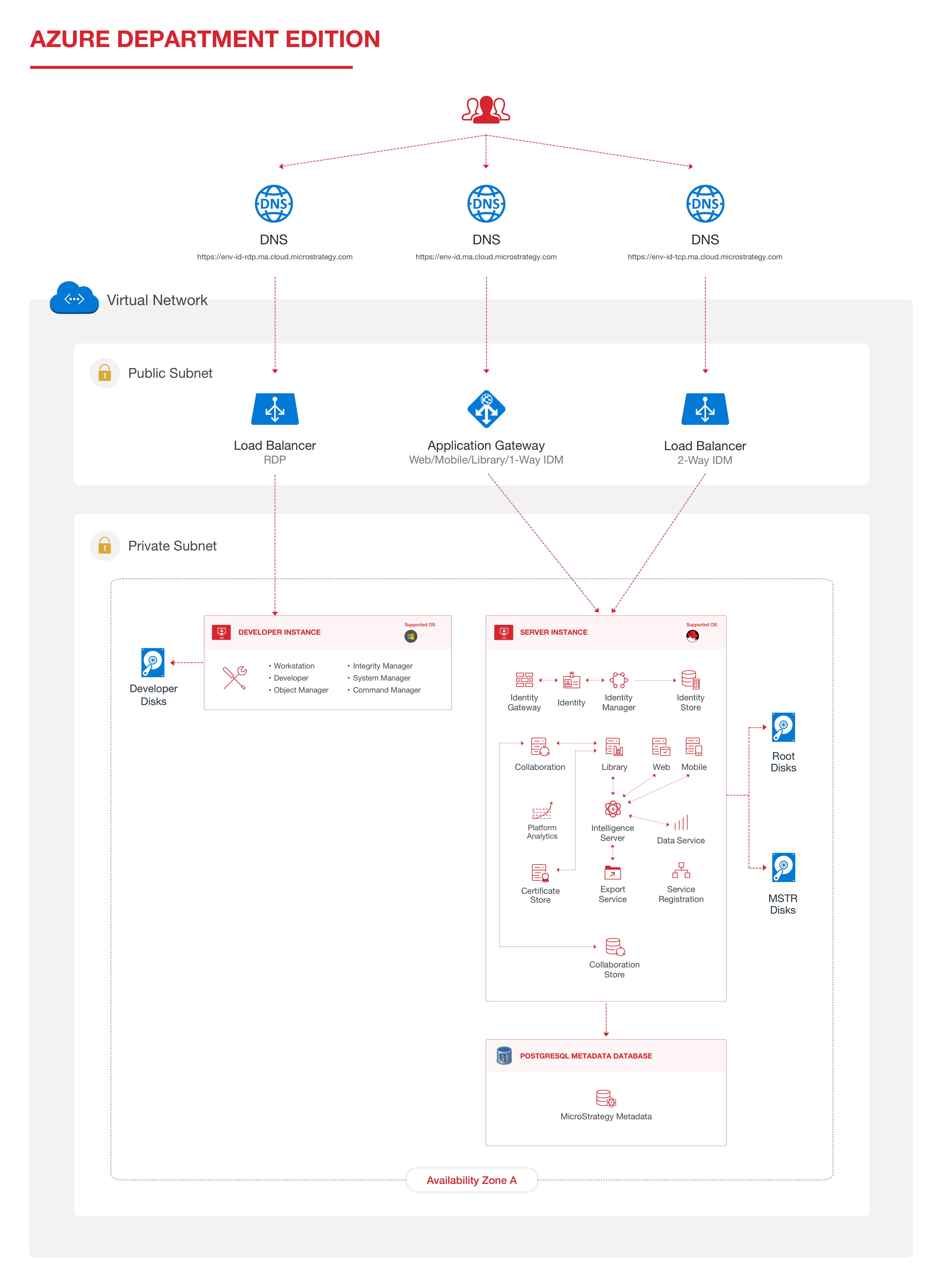 Ein wichtiger Unterschied zwischen „Team“ und „Abteilung“ ist der Ort, an dem die Metadaten gehostet werden. In Team-Umgebungen werden die Metadaten auf demselben RHEL-7-Computer wie der Intelligence Server gehostet. In Department-Umgebungen werden die Metadaten im vollständig verwalteten Azure-Datenbankdienst, der Azure Datenbank for PostgreSQL, gehostet.
