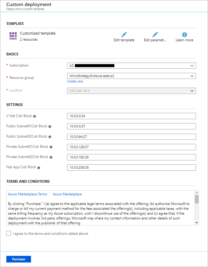 系统将在 Azure 门户中打开“Custom Deployment(自定义部署)”页面。Azure 资源管理器 (ARM) 用于创建配置和部署所需的 VNet 和存储帐户Strategy One平台。