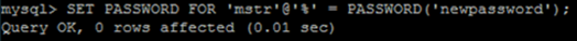 复制SET PASSWORD FOR 'mstr'@'%' = PASSWORD('newpassword'); -