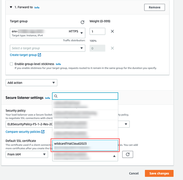 从默认 SSL 证书下拉菜单中,选择您在步骤 7 中导入的证书。