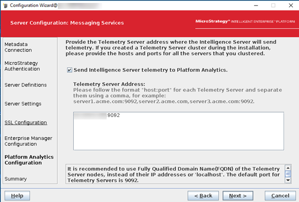 选择将 Intelligence Server 遥测数据发送到 Platform Analytics复选框。