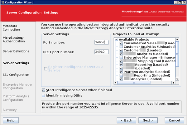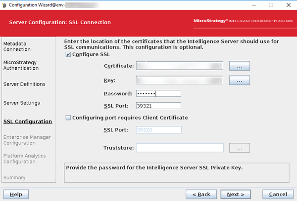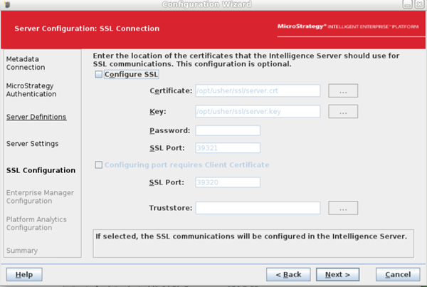 39321用作 Web Admin 中的 SSL 端口或/opt/apache/tomcat/latest/webapps/MicroStrategy/WEB-INF/xml/sys_defaults.properties文件。如果39321在 Web 中设置。选择配置 SSL复选框并使用证书和密钥,如下所示: