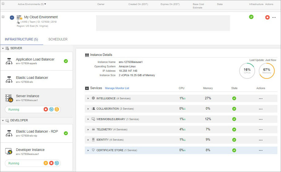 打开 基础结构选项卡,并展开“Server”(服务器)或“Developer”选项卡来监控环境的组件。