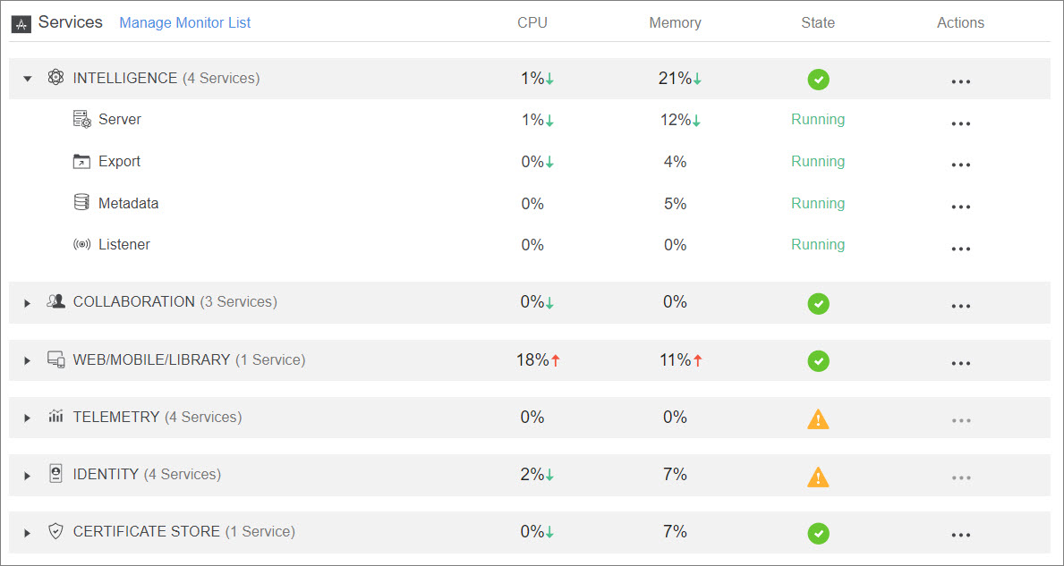 “服务”部分显示服务器实例上可用的所有服务及其资源消耗情况与当前的状态。展开服务可查看其相关子服务的详细信息。单击“动作”列中的