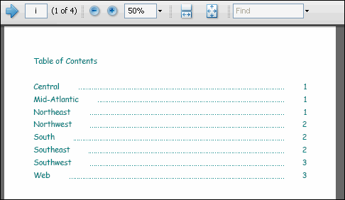 For example, a document is grouped by region and includes a table of contents. When you view the document as a PDF, the first page of the PDF is the table of contents. The entries in the table of contents are the regions, as shown below. A user can click a region (such as Central) or a page number to jump to that region in the PDF.