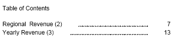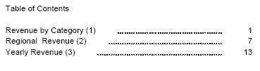 Each of the three layouts is listed in the table of contents. Change the table of contents to display before the second layout, Regional Revenue (2). Now the PDF displays the Revenue by Category (1) layout, followed by the table of contents shown below, which contains information for the last two layouts only: