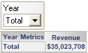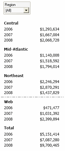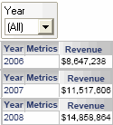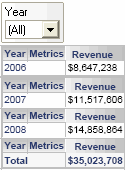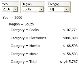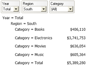 If you change Year to Total and Category to All, the revenue calculated is for the South, for all years, and for each category. The revenue amount for category total is much higher than the previous sample, because it contains all years, not just 2006.