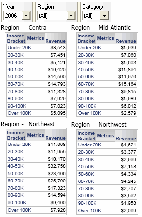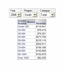 If the Grid/Graph is moved from the Category Group Header to the Region Header, the metric values are calculated differently. When Region is set to All, you cannot change Category. The revenue values are calculated for the various income brackets in 2006, as shown below. All regions and all categories are included in the calculations.