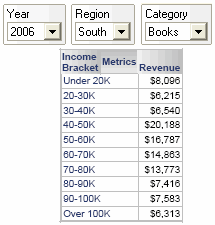 The revenue values in the Grid/Graph are calculated for the various income brackets in the South region in 2006 for books, as shown below.