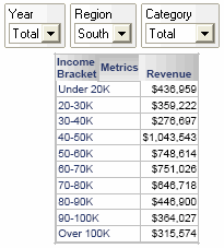 If you remove Category from the Grid/Graph and set Year to Total, the revenue values in the Grid/Graph are calculated for the various income brackets in the South region, as shown below. All years and all categories are included in the calculations. If the Grid/Graph displayed Year or Category, their page-by selections would show as Total.