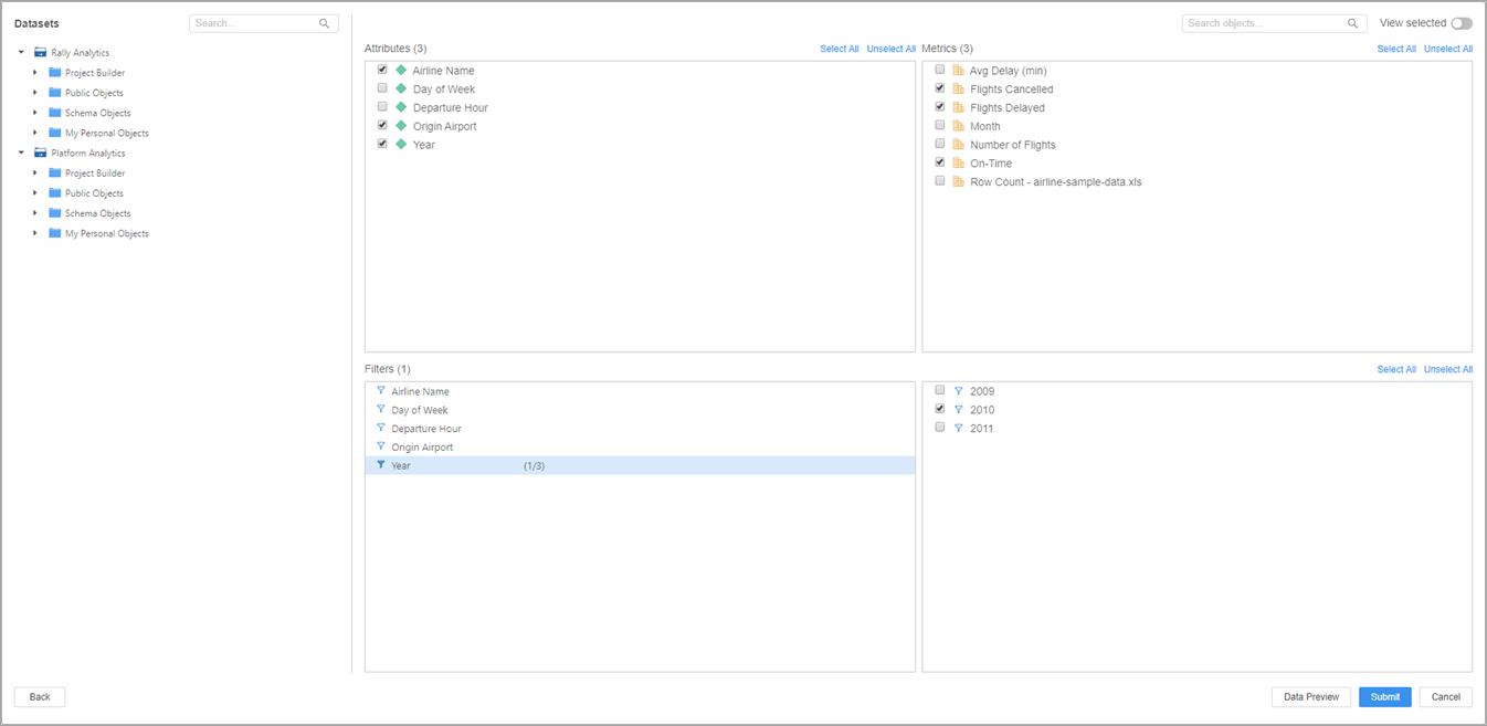 8. Wählen Sie die einzuschließenden Attribute, Metriken oder Filter aus.