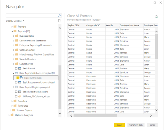 이 커넥터를 사용하여 MicroStrategy 프로젝트의 큐브 및 리포트에서 데이터 세트를 검색하여 Power BI에 삽입할 수 있습니다. 400만 개 이상의 행과 30개 이상의 열이 있는 데이터 세트를 가져올 수 있습니다.