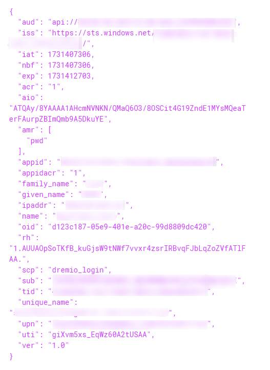See the following example token generated by Microsoft Entra ID: