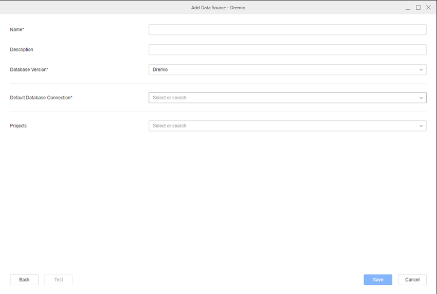- In the Add Data Source dialog, type a Name and Database Version, and optionally choose Projects for further data manipulation.