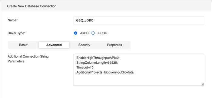 AdditionalProjectsJDBC connection string parameter to a comma separated list of additional projects to be loaded. Keep in mind that JDBC loads all projects/datasets by default, so this parameter can be used to load additional projects you may not be a member of, such as thebigquery-public-dataproject.