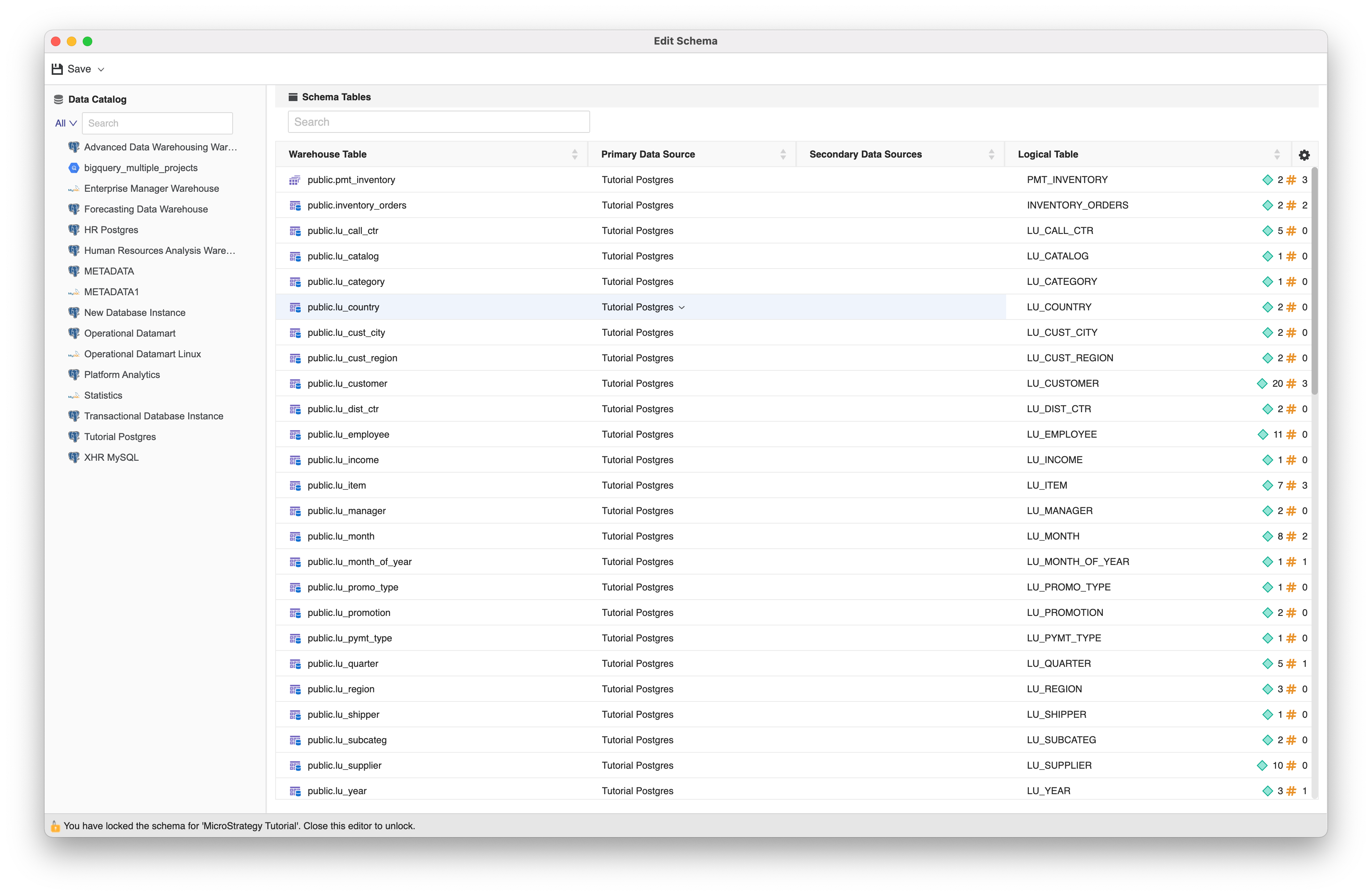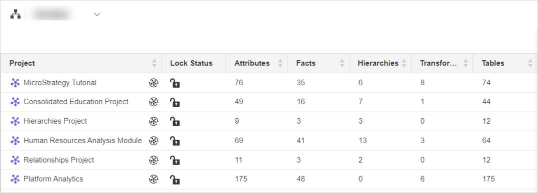 Workstation allows administrators to view schema information for a given environment. This information includes metric and attribute counts, information on hierarchies and transformations, and whether a given schema is locked or unlocked. You must have the System Administrator role to view schema information. See View Schema for more information.