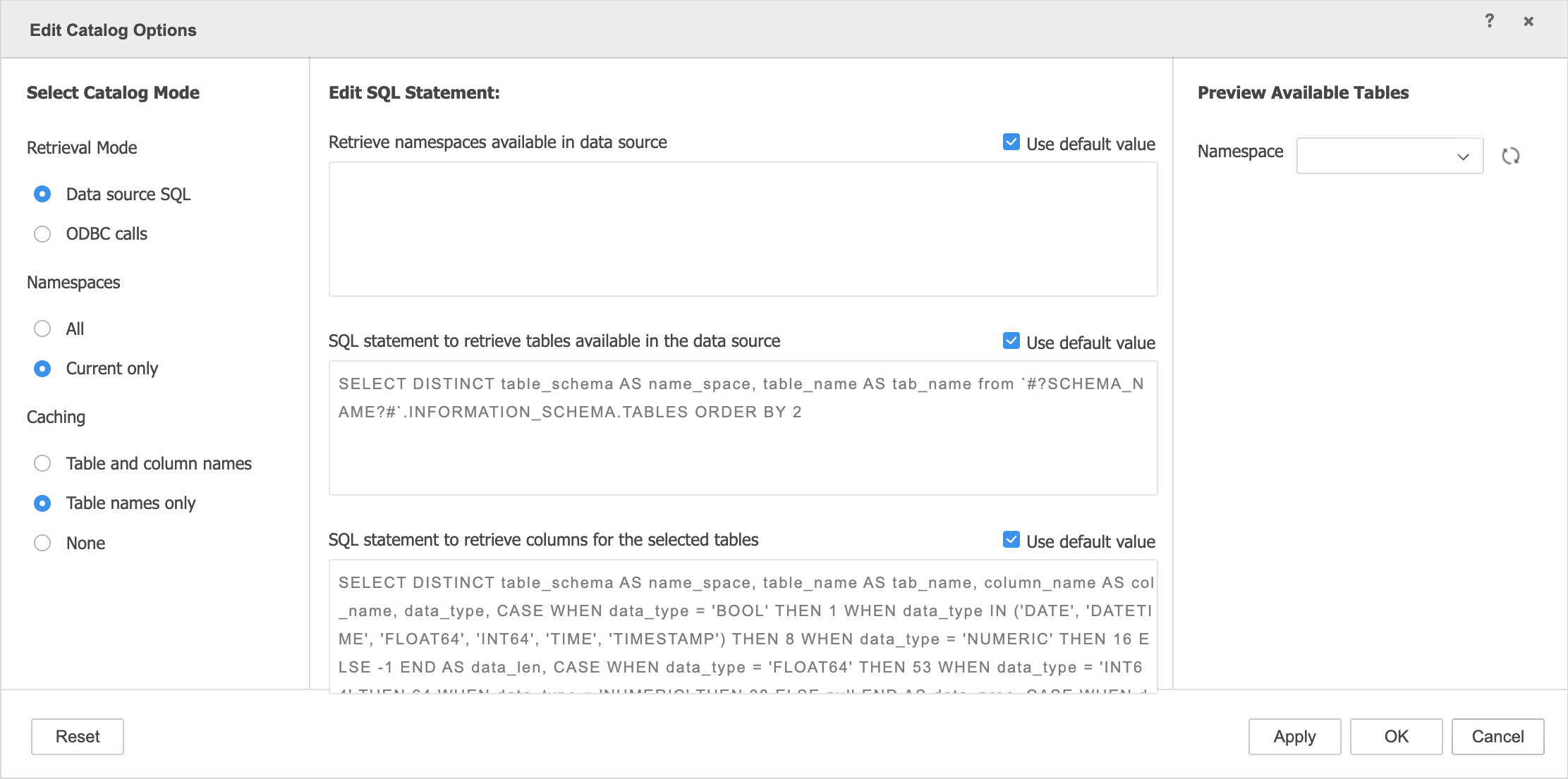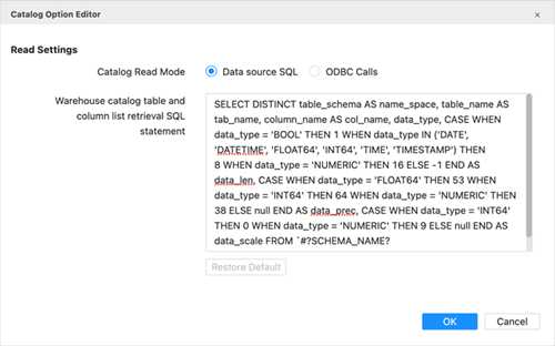 Select Data source SQL to switch from ODBC mode to SQL catalog retrieval. If you want to adjust the SQL queries, unselect Use default value to modify them.